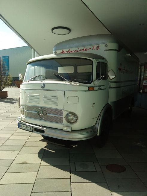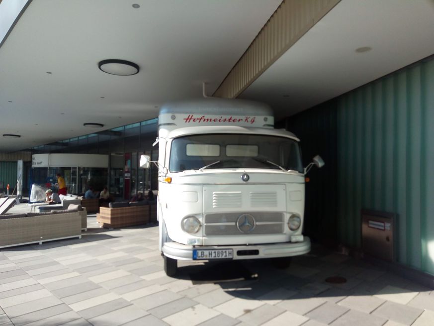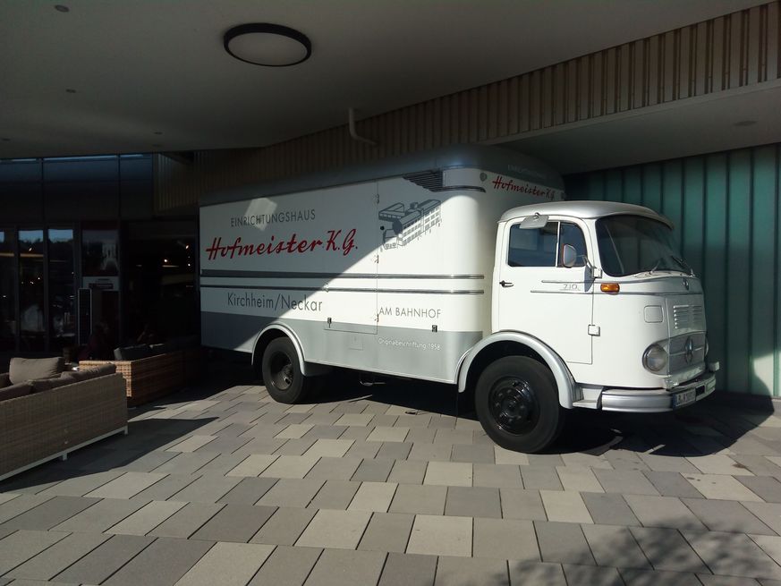 Der LKW stand zum Zeitpunkt der Aufnahme im Eingangsbereich von Möbel Hofmeister in Sindelfingen